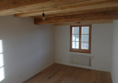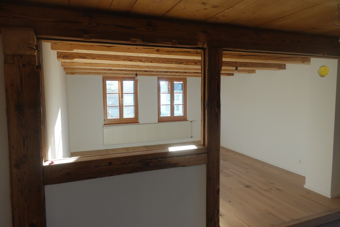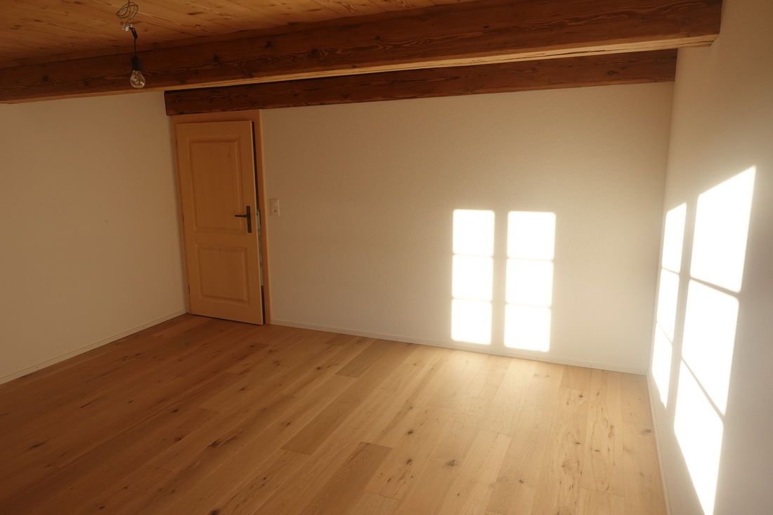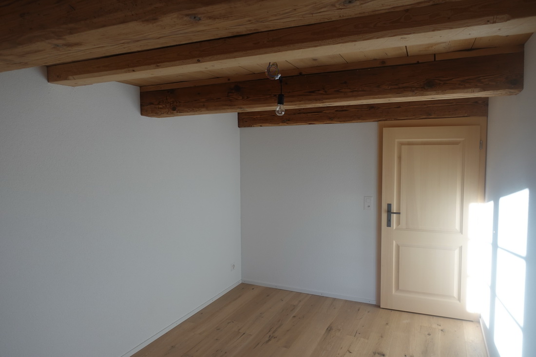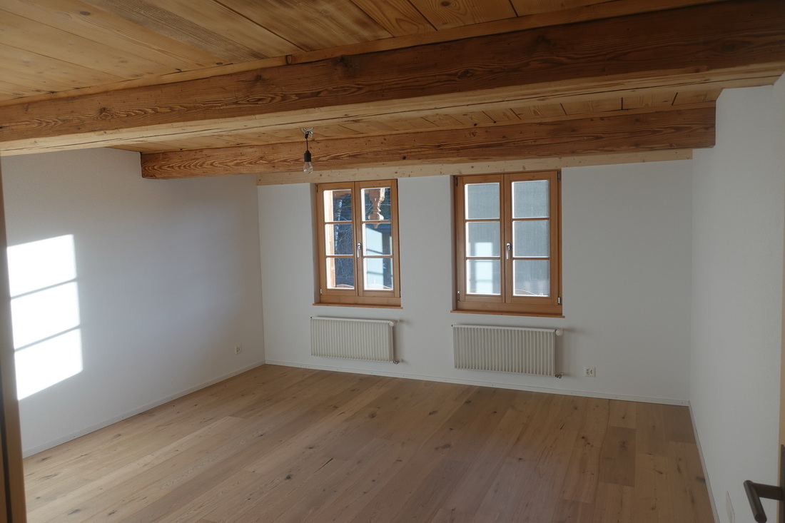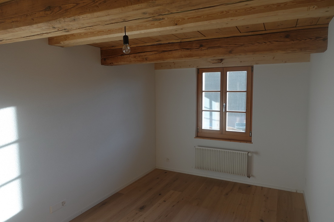 Die zu vermietende Wohnung wurde neu renoviert und verfügt mit den frei gelegten, grösstenteils noch originalen Balken über ein urtümliches Ambiente mit sehr viel Caché. Im 1. Stock befinden sich verteilt auf rund 100 m² 4 Zimmer, eine offene Küche mit Essplatz und das Bad. Drei Zimmer sind mit Eichenparkett ausgestattet, Gang und Küche sind mit Plattenboden versehen. Die exklusiv nutzbare Waschmaschine befindet sich im Bad, ein eigener Tumbler könnte zusätzlich darauf gestapelt werden. Im offenen Bereich zwischen Küche und Wohnzimmer wird aktuel ein Schwedenofen eingebaut.