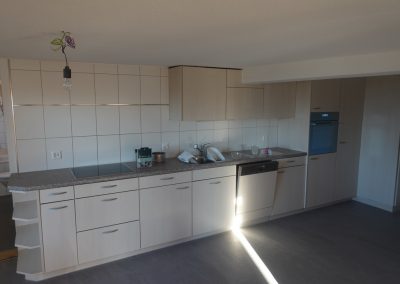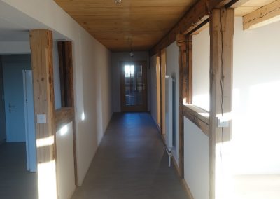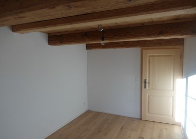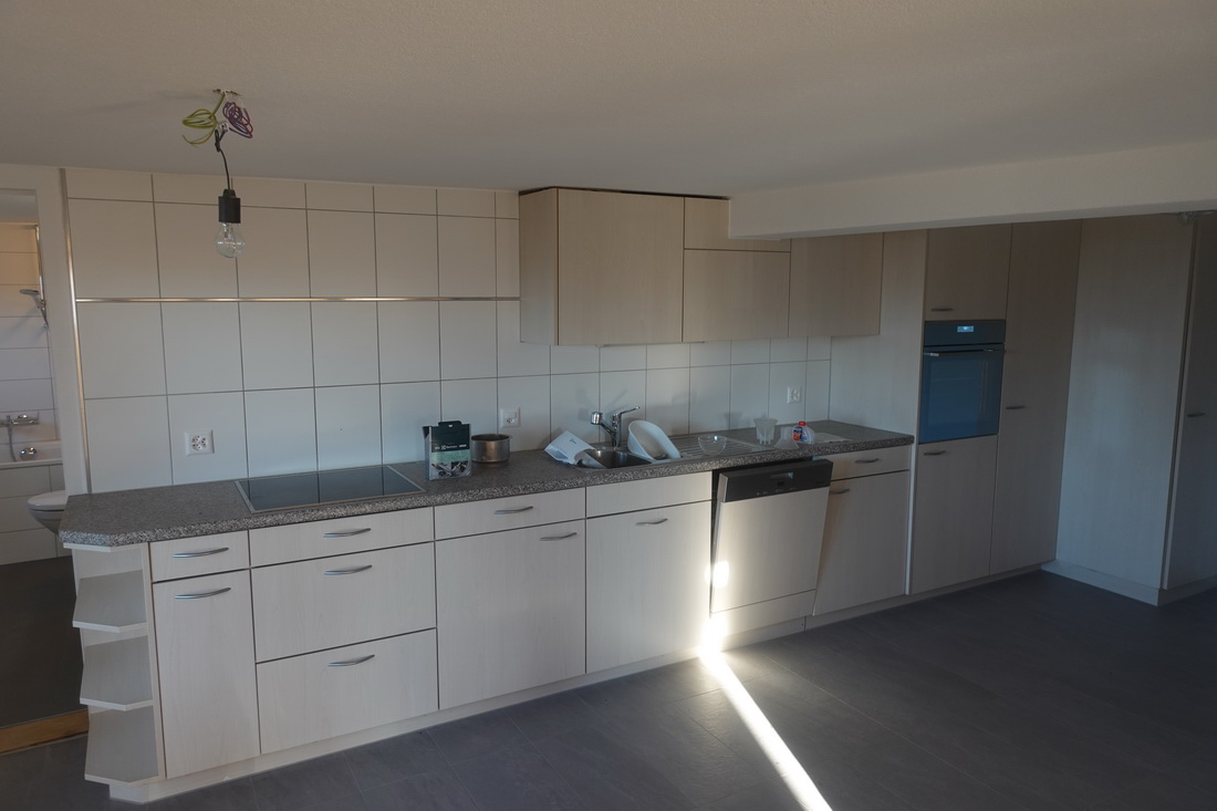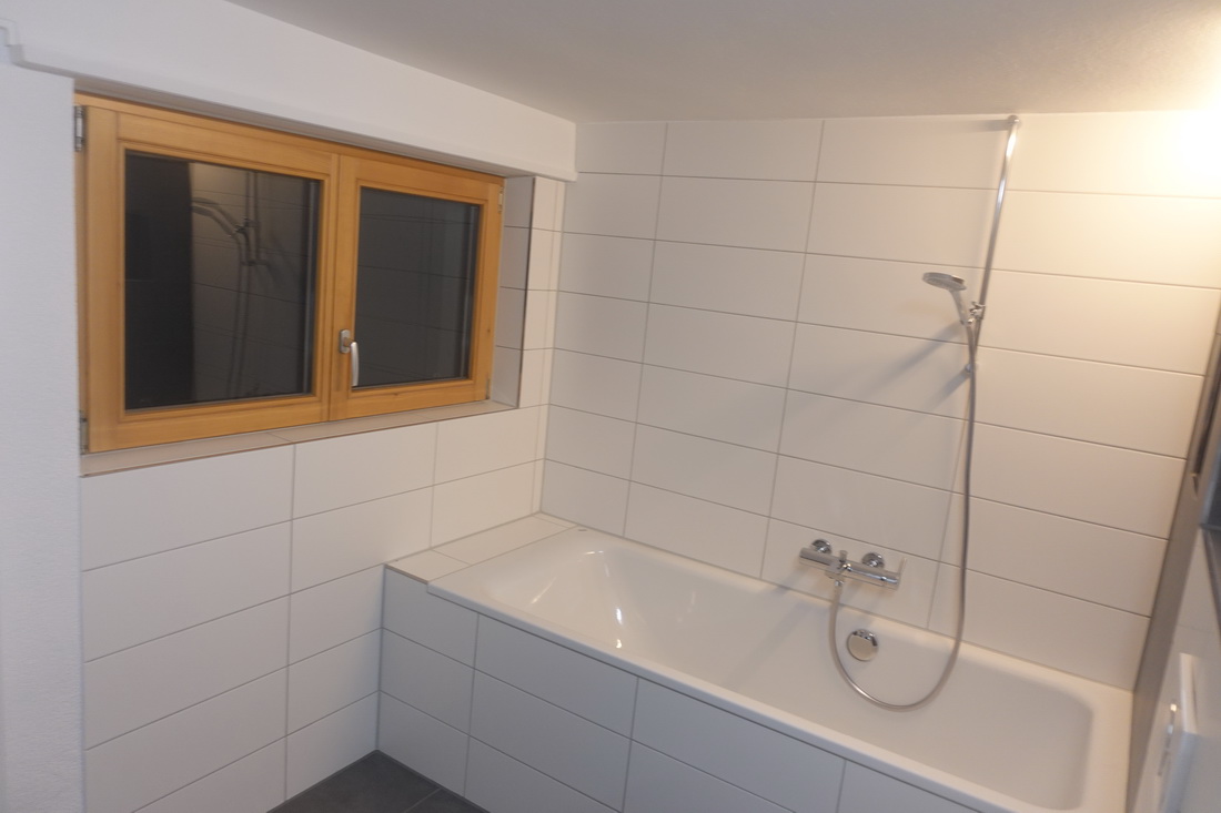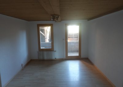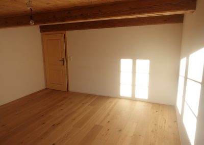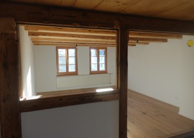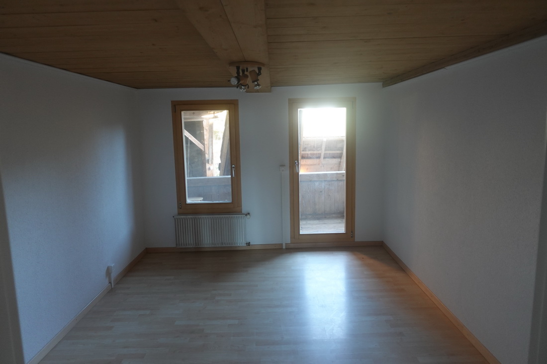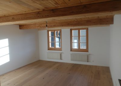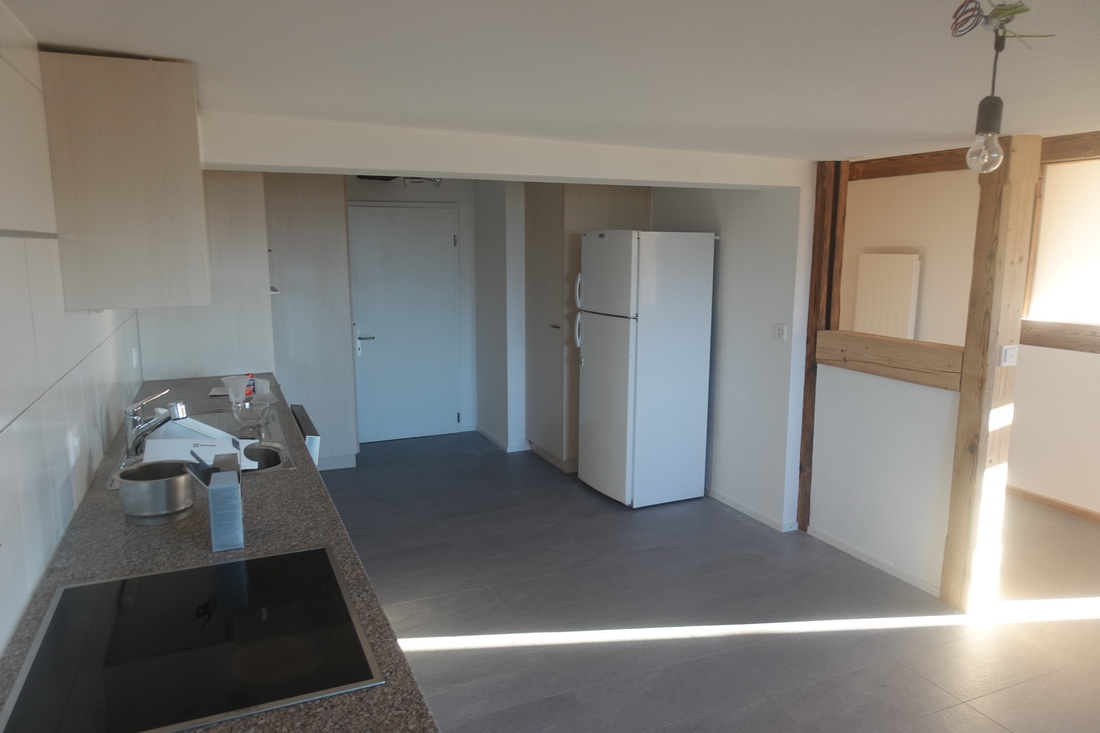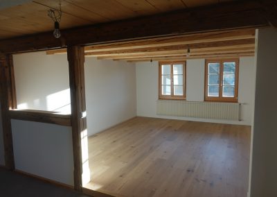 Die zu vermietende Wohnung wurde neu renoviert und verfügt mit den frei gelegten, grösstenteils noch originalen Balken über ein urtümliches Ambiente mit sehr viel Caché. Im 1. Stock befinden sich verteilt auf rund 100 m² 4 Zimmer, eine offene Küche mit Essplatz und das Bad. Drei Zimmer sind mit Eichenparkett ausgestattet, Gang und Küche sind mit Plattenboden versehen. Die exklusiv nutzbare Waschmaschine befindet sich im Bad, ein eigener Tumbler könnte zusätzlich darauf gestapelt werden. Im offenen Bereich zwischen Küche und Wohnzimmer wird aktuel ein Schwedenofen eingebaut.